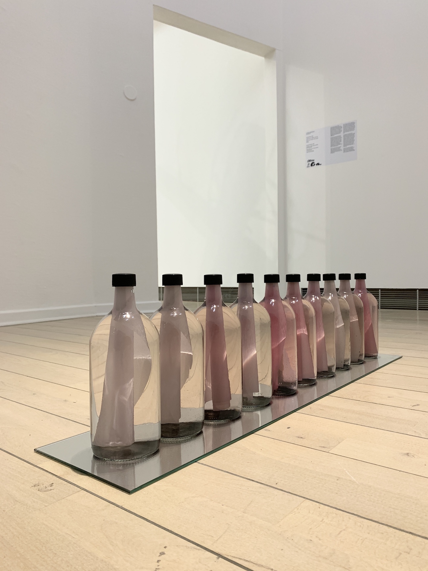 Catrin Andersson´s point of departure is often scientific research and natural history, and she works in the intersection between the scientific and the subjective. Ancient Blue takes its title from the oldest ice core ever discovered- an area in Antarctica with ice that is over 2.7 million years old. This ice is called "Blue ice" and preserves particles from meteorite strikes as well as carbondioxide. This allows for researchers to see environmental changes over a long time. The installation Decade (Decay) is comprised of ten reports from the Swedish Meteorological and Hydrological Institute on the ice in the Baltic Sea and the Gulf of Bothnia, showing how the ice mass has changed over a period of ten years. In the installation, Andersson has submerged prints of the reports in water. More ice equals more ink on the paper, and over time the inc dissolves from the paper and colours the water. The different hues that provide us with a visual diagram of the changes in the ice over time. In a direct and thoughtprovoking way, the work reflects how climate changes impact the environment. Andersson´s art balances between history and science, the present and the future. She often returns to water in different forms: It is both elusive and eternal, it exists as solid, liquid, and gas, and it is something to wich all life relates. Exhibition text, Malmö museum. |